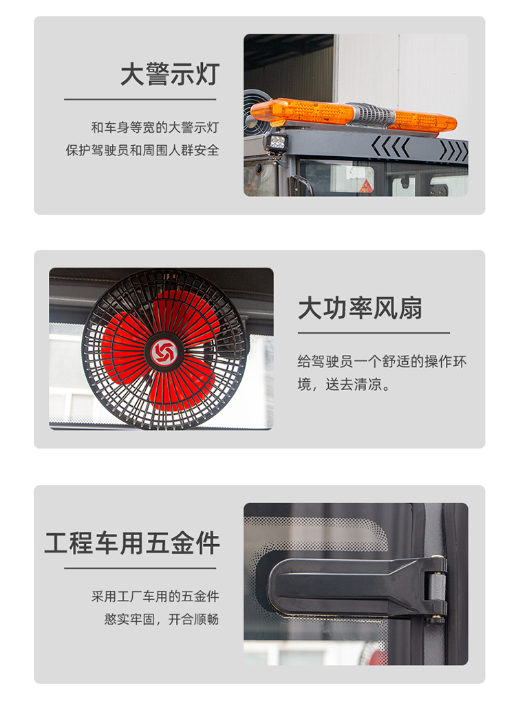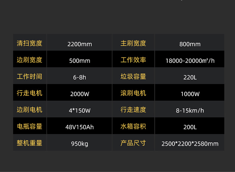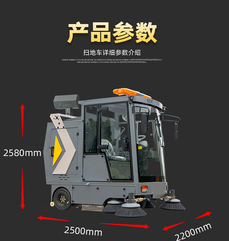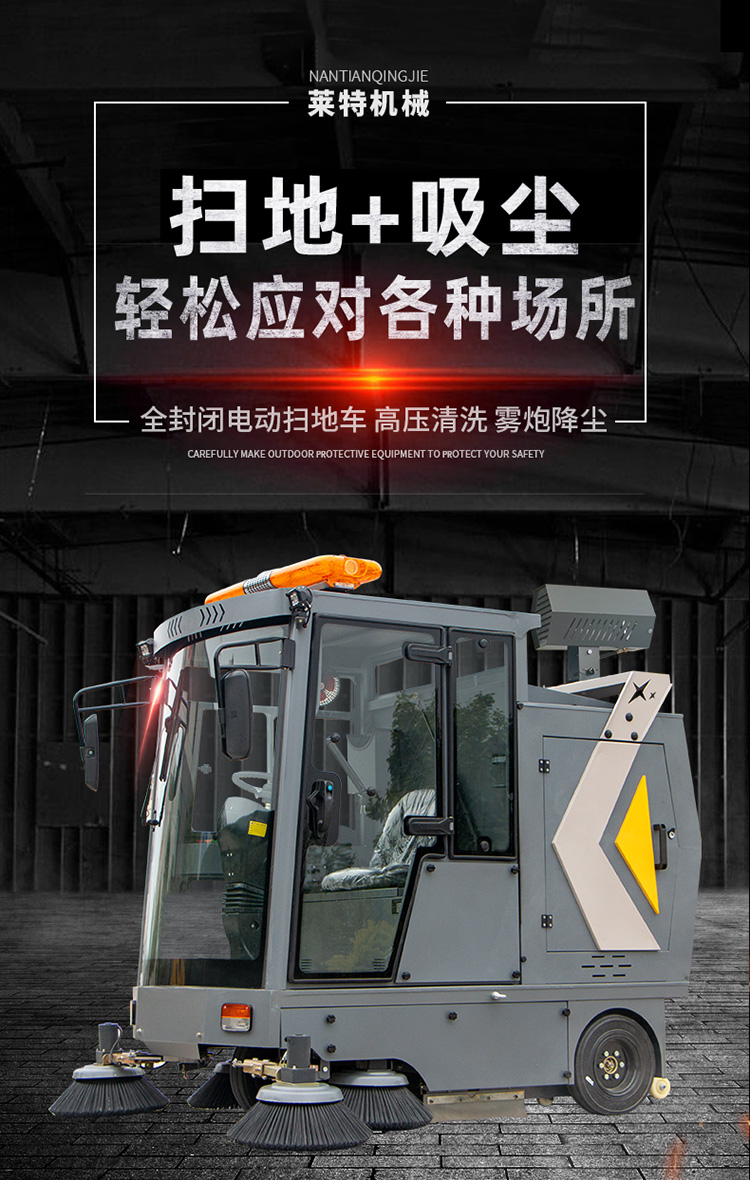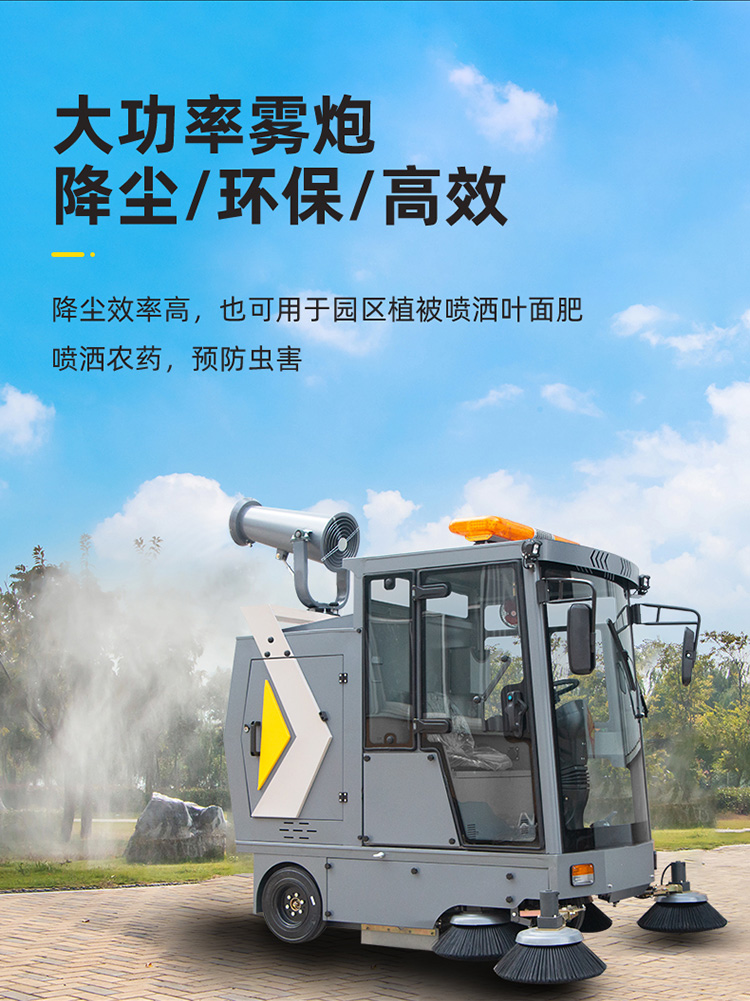 莱特LT-G22型全封闭驾驶式扫地车,配备高压清洗和高压雾炮功能,清扫宽度2200mm,满电工作时间为6-8小时,工作效率:16500㎡/h,采用的是6块150A的铅酸免维护电池。高压雾炮射程可达10米以上,可对作业环境高效的降尘,还可以用于绿植养护和环境消杀。高压水枪可以对地面顽固污渍进行清洁,还可以冲洗路牙石,为绿植浇水,工作之余,还可以用高压水枪清洗车辆。应用场景为:厂区、车间、公园、街道、物业小区、码头、学校、机场等需要大面积清扫的区域区域。